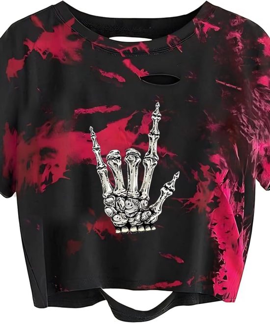 Skeleton Hand “Rock On” Graphic Crop Top – Pink Tie-Dye Distressed Streetwear