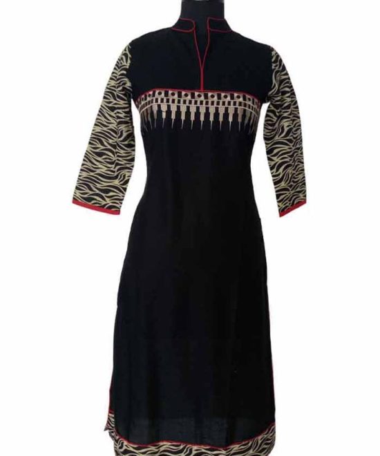 Women’s Ebony Black Straight Kurta with Abstract Print Sleeves & Mandarin Collar