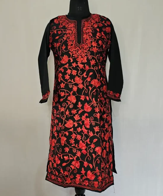 Women’s Midnight Black Long Kurta with Vibrant Red Kashmiri-Style Floral Embroidery