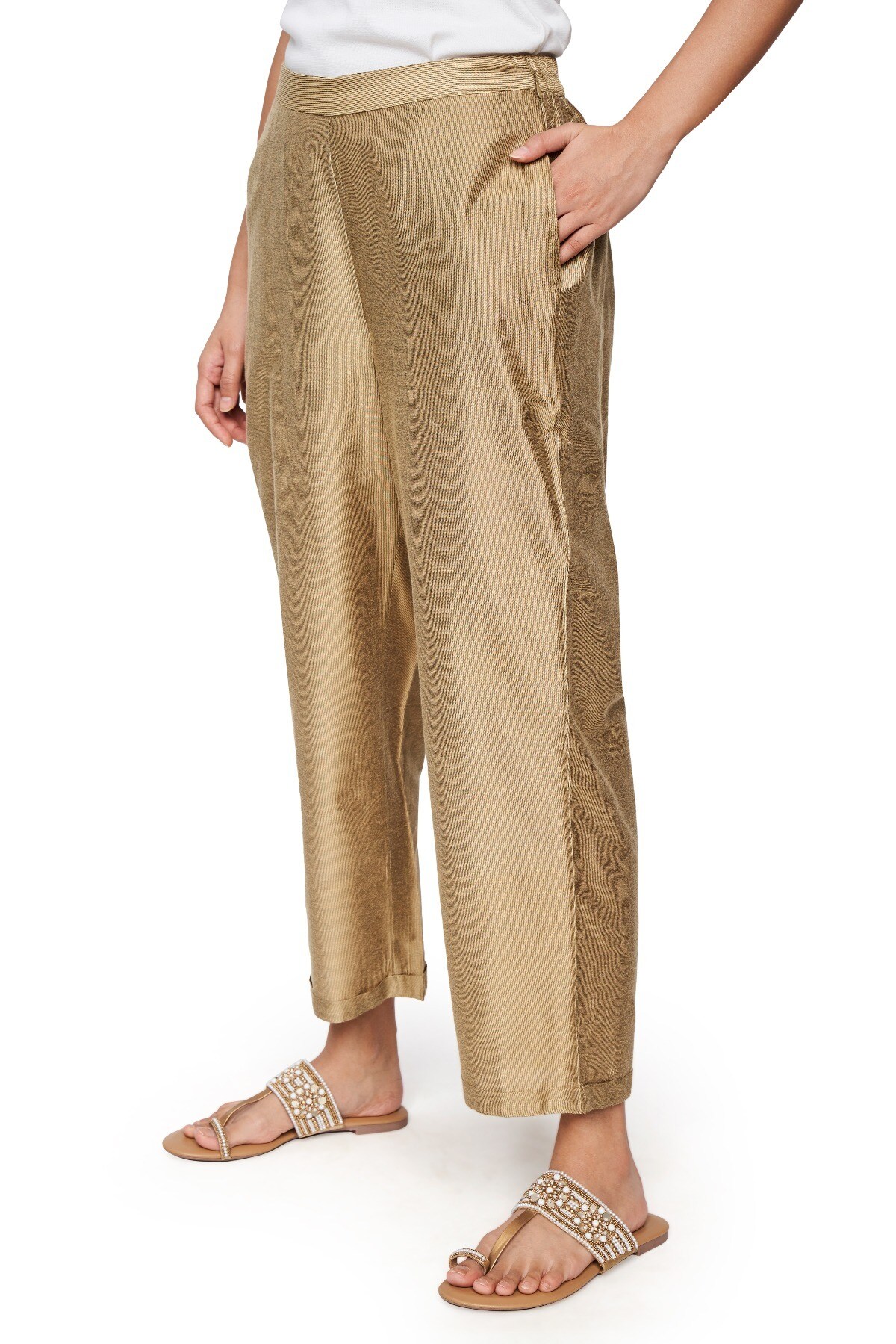 The muted gold tone makes them incredibly easy to pair—wear them with a crisp white blouse for a clean, minimalist aesthetic, or style them with a rich silk tunic for a traditional ethnic-fusion look. Complete with functional side pockets and a durable finish, these trousers are as practical as they are beautiful.