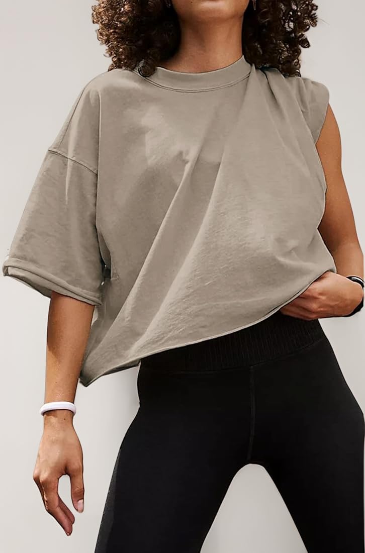 The neutral “greige” earth tone makes it an incredibly versatile staple, seamlessly blending with your existing closet. Made from a heavy-weight yet breathable cotton, it provides a structured drape that creates a flattering, boxy fit. Whether you’re heading to a morning yoga session, running errands, or meeting friends for coffee, this top offers a “cool-without-trying” vibe.